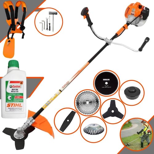 Roçadeira Lateral VULCAN VR520H À Gasolina 2 Tempos 52cc 2,5HP + Faca 2 Pontas 330mm + Faca 40 Dentes 255mm + Faca 80 Dentes 255mm  + Escova 38 Cerdas + ÓLEO CASTROL STIHL 500ml