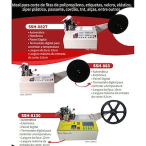Máquina de corte de fitas quente e fria com 10cm de boca, painel de controle digital e controlador de temperatura digital. Corta tiras com milímetros de precisão.Funções