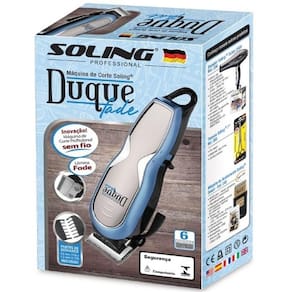 Máquina de corte soling duque fade sem fio - cordless - bivolt automático (110-240v 50/60 hz) - pode ser usada com ou sem cabo - potência: 5w - tempo de carregamento: 4 - 5 horas - tempo de utilização: 4 - 5 horas - bateria: 2000 mah lithium battery - certificado de segurança compulsória do INMETRO INMETRO OCP 0004 Acessórios que acompanham o produto: - pente 3mm e 6mm - pente 9mm e 12mm - pente 0,5mm e 1,5mm (disfarce) - escova de limpeza - óleo lubrificante - adaptador A soling garante este produto por 6 meses a partir da data de compra do produto, acompanhado da nota fiscal e da garantia devidamente preenchida. Nossa garantia não cobre os fios, carcaças e lâminas. Ficha técnica - É recarregável: Sim - Cor: Azul - E lavável: Não - Quantidade de pentes: 6 - É sem fio: Sim - Tipo de motor: Magnético/Vibratório Medidas aproximadas do produto - Comprimento: 22 cm - Altura: 7 cm - Largura: 15 cm - Peso: 530 g