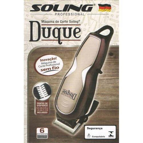 Máquina de cortar Cabelo Soling Duque s/ fio- Bivolt automático (110-240 V ¦ 50/60 hz).- Pode ser usada com ou sem cabo.- Potência: 5w- Tempo de carregamento: 3 - 5 horas.- Tempo de utilização: 3 - 5 horas.- Bateria: 2000 mAh Lithium battery.- 6 meses de garantia.- Certificado de Segurança Compulsória do INMETRO.Acessórios que acompanham o produto:- Pente 3mm e 6mm.- Pente 9mm e 12mm.- Escova de limpeza.- Óleo lubrificante.- Adaptador.A Soling garante este produto por 6 meses a partir da data de compra do produto, acompanhado da Nota Fiscal e da garantia devidamente preenchida. Nossa garantia NÃO COBRE OS FIOS, CARCAÇAS E LÂMINAS.