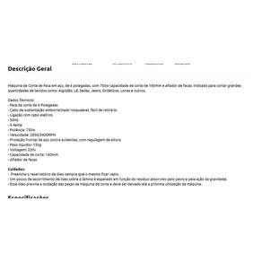Dados Técnicos: - Faca de corte de 6 Polegadas - Cabo de sustentação emborrachado rosqueável, fácil de retirá-lo - Ligação com cabo elétrico - 50Hz - 4.4amp - Potência: 750w - Velocidade: 2850/3400RPM - Proteção frontal de aço contra acidentes, com regulagem de altura - Peso líquido 15kg - Voltagem: 110V - Capacidade de corte: 160mm - Afiador de facas