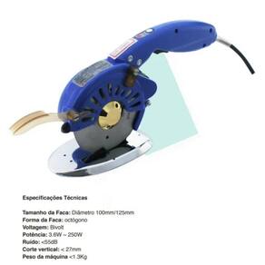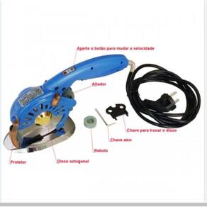Especificações técnicas: Motor direct-drive Disco octogonal de 4 polegadas 3 níveis de velocidade Capacidade de corte de até 2,7 cm. Iluminação led na frente do disco Protetor e guia de corte Amolador acoplado ao disco Rodízios para máquina deslizar sobre a mesa de corte Velocidade de 600 a 1200 rpm Potência de 200 whatts. Corta todo tipo de tecido Baixo ruído 55 decibéis Voltagem: bivolt 110 ou 220 volts