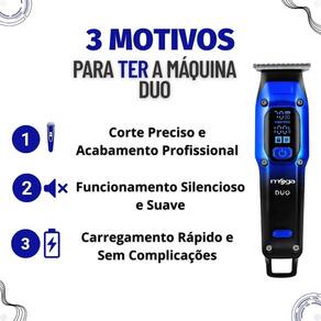 Para garantir a longevidade e o desempenho ideal da sua Máquina Mega Duo, limpe as lâminas regularmente com a escova de limpeza fornecida, removendo todos os resíduos de cabelo. Lubrifique as lâminas periodicamente com óleo específico para máquinas de corte, conforme as instruções do manual. Armazene o aparelho em local seco e seguro, longe da umidade e do alcance de crianças.