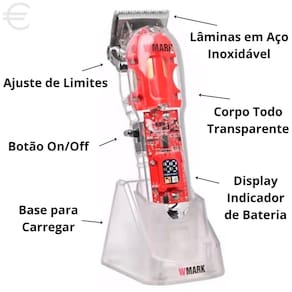 blade alta lâmina de aço carbono, pode ser ajustada para zero-sobreposição. Bateria de lítio 1800 mah, 2 horas de carga completa para 180 minutos de uso. Display com led exibição de energia da bateria restante. Base para carregamento material abs. Cor transparente