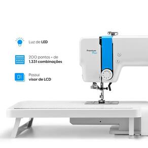 200 pontos de costura; Mais de 1.300 combinações possíveis; Visor LCD; Passador automático de linha; Velocidade de até 700 rpm; Mesa extensora inclusa; Kit de acessórios completo; Tecla Start/Stop; 8 casas de botão; Pregão botão de 2 ou 4 furos; Rebaixador de dentes; Parador de agulha; Garantia de 1 ano.Alça retrátil