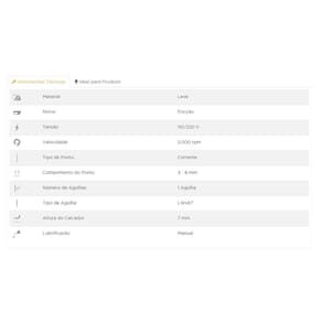 Base cilíndrica 01 agulha Regulagem do tamanho do ponto através de seletor Tamanho máximo de ponto 8 mm Altura máxima do calcador - máximo 12 mm Velocidade da costura - 2500 ppm Montada com motor de baixa velocidade de 1/3 HP.