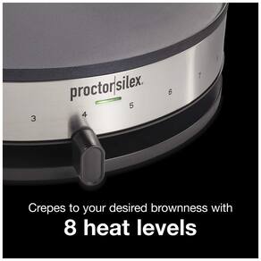 Máquina de crepe elétrica Proctor Silex com superfície antiaderente, 8 níveis de calor e 1000W de potência. Ideal para preparar crepes doces e salgados, tortilhas e panquecas.Porta-fio
