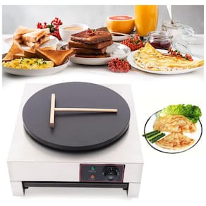 Máquina de crepe elétrica profissional com painel de aquecimento extra grande, concha de aço inoxidável, termostato ajustável (50-300°C) e aquecedor tipo gaveta.Porta-fio
