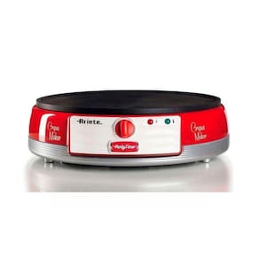 Máquina de Crepe retrô com design exclusivo dos anos 50. Placa elétrica antiaderente com 28 cm de diâmetro. Inclui duas espátulas de madeira e um enrolador de massa.Porta-fio