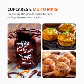 CUPCAKES E MUITO MAIS: A máquina de cupcake Mondial prepara 7 cupcakes ao mesmo tempo, além de diversas receitas como muffin, pão de queijo, tortinha, petit gateau, bolinho de chuva e muito mais.