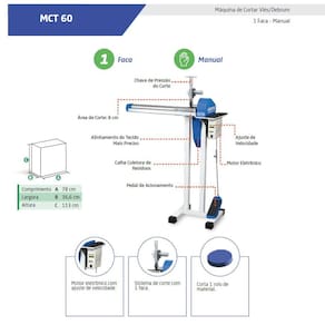 A construção robusta e durável da MCT 60 oferece longa vida útil e baixa manutenção, garantindo anos de serviço confiável e produtivo. Você pode contar com esta máquina de corte de viés/debrum para otimizar seus processos de trabalho.