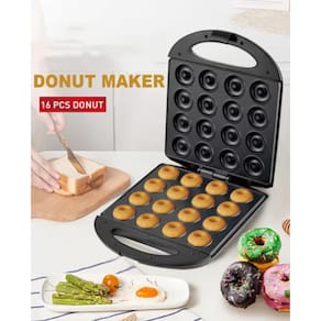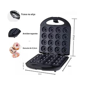 MAQUINA DE DONUTS VTR-04139 110V Máquina de Donuts Elétrica - Praticidade e Sabor na Sua Cozinha\nPrepare donuts caseiros de forma rápida e prática com a Máquina de Donuts Elétrica. Compacta e fácil de usar, ela é perfeita para quem quer saborear donuts fresquinhos em casa, sem complicação.\nCom capacidade para assar até 7 mini donuts por vez, possui placas antiaderentes que evitam que a massa grude e facilitam a limpeza. Basta preparar a massa, colocar nas cavidades e em poucos minutos seus donuts estão prontos, dourados e deliciosos.\nCaracterísticas do produto:\nCapacidade: 16 mini donuts por vez\nRevestimento antiaderente\nLuz indicadora de funcionamento e aquecimento\nAquecimento rápido e uniforme\nBase antiderrapante para maior segurança\nDimensões aproximadas: Comprimento: 22 cm Largura: 18 cm Altura: 10 cm Peso: 1,2 kg Potência: 750W Voltagem: 110V\nIdeal para cafés da manhã, lanches da tarde ou até para quem quer empreender com produção de donuts artesanais. Com a Máquina de Donuts, você leva mais sabor e praticidade para o seu dia a dia.