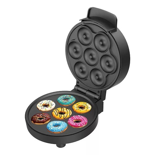 Máquina de donuts elétrica 110V com potência de 1000W, capacidade para 7 furos, chapa antiaderente, luzes indicadoras de funcionamento e proteção contra superaquecimento.Chapa antiaderente