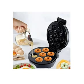 Máquina de fazer donuts com material antiaderente, 7 furos, luzes indicadoras de alimentação e pré-aquecimento, alça coberta, tampa com travamento seguro, pés verticais para armazenamento compacto, desligamento automático por superaquecimento, controle automático de temperatura, pés antiderrapantes.Chapa antiaderente
