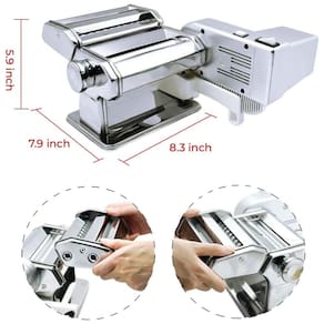Os rolos multifuncionais são ajustáveis e podem ser alterados para fazer diferentes tipos de massa, incluindo ravioli. O pacote contém motor e manivela para atender a diferentes necessidades pessoais. A espessura da massa pode ser ajustada de 0,5 a com botão e a largura pode ser enrolada até 150 milímetros de largura. Há também um grampo para garantir que a máquina não se mova ao fazer macarrão. DETALHES DO PRODUTO Cor Prata Material Corpo em aço inoxidável. Rolos e cortadores em alumínio anodizado. Frequência50Hz Potência70W Voltagem110Vmotor NOTA Esta máquina de massas não pode ser lavada com água. A máquina de massas pode ser limpa com um pano de prato limpo e seco. Por segurança, antes de limpar e manter sua máquina de fazer macarrão, desconecte, certifique se de que a máquina esteja desligada e remova o motor. O pacote inclui máquina de macarrão, cortadores de macarrão estreitos e largos, rolo para fazer ravioli, manivela, motor, braçadeira ajustável e instruções do produto