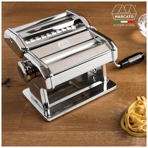 A famosa Máquina de Fazer Massas MARCATO Atlas 150 rola e corta a massa para preparar lasanha, fettuccine e tagliolini de forma tradicional em casa. Feita na Itália em aço cromado, esta máquina inclui cortador de massa, manivela manual e grampo de fixação. Com capacidade para laminar a massa até 150 milímetros de largura em 10 espessuras diferentes, de 0,6 a 4,8 milímetros, garantindo uma textura consistente, tempo de cozimento e sabor perfeitos. A Atlas 150 não é compatível com lava-louças. Possui conexão para motor elétrico de massas e 12 acessórios de corte de massas vendidos separadamente. Material resistente em aço niquelado, aço cromado e ABS.