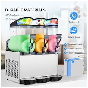 A Máquina de Frozen ROVSUN é feita com material de alta qualidade em aço inoxidável 304 e PC de qualidade alimentar, garantindo durabilidade, resistência à corrosão e visão clara. Compressor potente de 900W e condensador de cobre garantem refrigeração rápida, produção acelerada de frozen, economia de energia e baixo ruído. Fácil de usar, com painel de controle simples e display digital de temperatura. Possui modo de frozen, modo de suco/noturno e modo de limpeza. Tanques independentes, bandejas removíveis, pés antiderrapantes e acessórios práticos incluídos. Ideal para uso doméstico e comercial em restaurantes, bares, festas, etc. Capacidade de 45 litros.