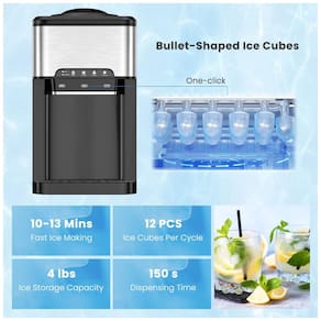 Máquina de Gelo 3 em 1: Dispensador de Água e Gelo: Nosso dispensador de água de bancada oferece 3 opções de temperatura: água quente (=90°C), água fria (=8°C) e cubos de gelo fresquinhos, de acordo com a sua necessidade. Ele pode produzir 12 cubos de gelo em forma de bala por ciclo em apenas 10-13 minutos, garantindo praticidade e rapidez para o seu dia a dia.