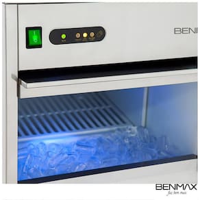 A Máquina de Gelo Benmax é produzida inteiramente em aço inox, o que garante sua durabilidade e resistência. A porta frontal também é feita em aço inox, conferindo um design elegante e sofisticado ao produto. Além disso, a máquina possui luz de led em seu interior, proporcionando requinte e iluminação ao ambiente.
