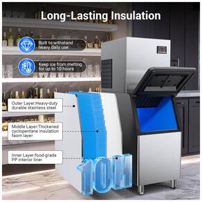 Bin de armazenamento para 181 kg incorpora isolamento de alta eficiência que mantém o gelo sólido por até 10 horas. Construção em tripla camada com carcaça de aço inoxidável, espuma espessada e interior PP grau alimentício garante retenção térmica superior e contato higiênico com água e gelo.