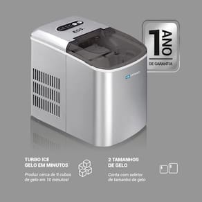 Características: - Turbo Ice que produz 9 cubos de gelo a cada 10 minutos - Não necessita instalação hidráulica - Painel Eletrônico Digital - Seletor de tamanho de gelo, pequeno ou grande - Indicador de funcionamento, de falta de água e de reservatório de gelo cheio - Acompanha cesto de gelo e pazinha coletora - Super silencioso - Dreno para limpeza