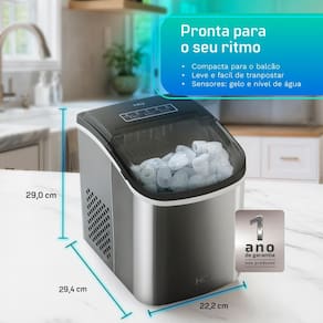 Máquina de gelo com produção de 12 kg/24h, ciclo de 712 minutos, 2 tamanhos de cubo (Pequeno e Grande), sensores de falta d'água e cesto cheio, refrigerante R600a, classe climática T (Tropical), acabamento em Inox com janela na tampa. Possui função autolimpeza e dreno frontal.Capacidade de armazenamento de gelo