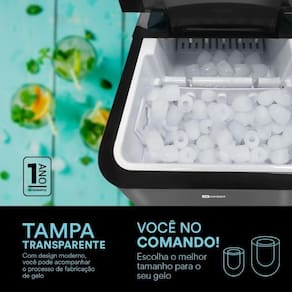 Compacta e portátil, design moderno, painel eletrônico digital, super silencioso, seletor de tamanho de gelo (pequeno ou grande), tampa em acrílico transparente, função de auto limpeza.Capacidade de armazenamento de gelo