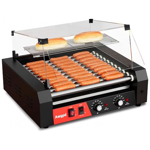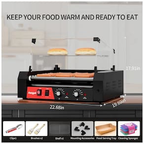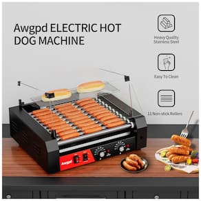 Os rolos de aço inoxidável de grau alimentício desta máquina de hot dog possuem 11 rolos e um potente elemento de aquecimento de 1670W, capaz de grelhar até 30 cachorros-quentes simultaneamente. Alimentos pré-cozidos ou descongelados podem ser inseridos para aquecimento. Feito de aço inoxidável de calibre pesado de alta qualidade, proporcionando excelente resistência à ferrugem e corrosão. Os rolos de aço inoxidável de grau alimentício são antiaderentes para facilitar a limpeza. Durável, reduz a manutenção necessária, economizando tempo e dinheiro. Com rotação de 360 graus dos rolos, garantindo o cozimento uniforme de todos os cachorros-quentes. Os controles de temperatura regional permitem ajuste separado de até 482°F. Ideal para negócios de alimentos como lanchonetes, restaurantes, lojas de conveniência e padarias. Uma maneira fácil e rápida de grelhar cachorros-quentes, salsichas e mais.