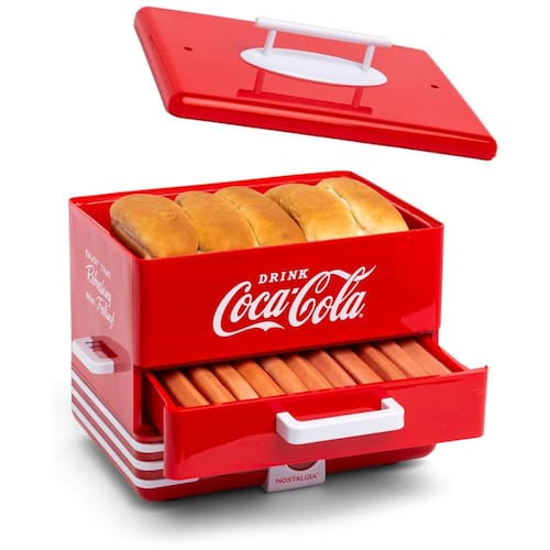 Máquina de Hot Dog Nostalgia Coca Cola para até 24 salsichas, com sistema de vaporização e aquecedor de pão para 6 pães. Possui botão de cozimento com 3 posições, janela de nível de água e zenamento de cabo oculto.