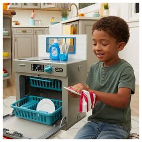 Agora as crianças podem simular lavar a louça como os adultos com a super realista Lava-Louças Infantil Little Tikes First Dishwasher. Esta lava-louças de brincar elegante e moderna está repleta de recursos interativos, como uma porta funcional, gaveta de detergente deslizante, suportes de pratos removíveis e um tapete para secagem. Além disso, inclui luzes e sons realistas. O botão emite um clique ao girar e as crianças podem ativar os efeitos luminosos de lavagem na porta. Fingir lavar a louça e realizar outras tarefas domésticas ajuda as crianças a desenvolver um senso de responsabilidade, parte importante da aprendizagem socioemocional. A First Dishwasher é fácil de montar em tamanho real e encaixa todos os 14 acessórios incluídos para facilitar a limpeza. Incentive as crianças a se envolver em brincadeiras imaginativas e de faz de conta com a Lava-Louças First Dishwasher da Little Tikes!