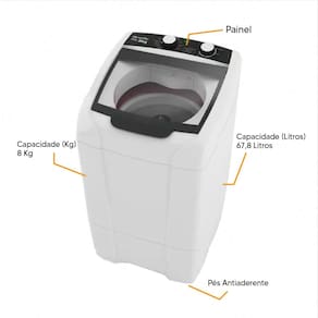 Máquina de Lavar Automática com capacidade de 8kg, ciclo rápido, abertura superior, 11 programas de lavagem, 4 níveis de água, dispenser triplo (sabão, amaciante, alvejante), filtro para fiapos no agitador, saída de água com sistema de reaproveitamento, motor com protetor térmico, pés reguláveis e tampa transparente.Centrifugação