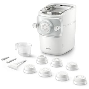 Máquina de macarrão totalmente automatizada com tecnologia de mistura avançada. Produz até 8 porções em menos de 10 minutos. Possui motor potente, pá de mistura de metal robusta e painel frontal de metal resistente. Câmara de mistura e barra de mistura de metal garantem base uniforme. Design elegante e durável.Acessórios