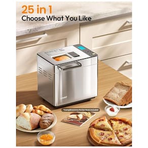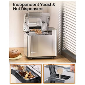 A Máquina de Pão KOVIET 25 em 1 apresenta 25 programas customizáveis, permitindo a preparação de pães integrais, sem glúten, bolos, geleias, iogurtes e massas diversas. Tem dispensadores duplos automáticos para liberação precisa dos ingredientes no momento ideal, com controle adaptativo de temperatura para garantir o sucesso do processo. Seu corpo em aço inoxidável reforçado e cuba antiaderente de alta condutividade térmica proporcionam durabilidade e cozimento uniforme, potencializando a reação de Maillard para crostas mais crocantes. A circulação de ar por convecção assegura aquecimento balanceado. O motor brushless de 650 W opera silenciosamente com alta performance e eficiência energética. Timer programável até 15 horas e função manter aquecido por 1 hora. Proteção contra falhas de energia por 10 minutos. Permite escolher entre três tamanhos de pão (454 g, 680 g e 907 g) e três níveis de crosta (clara, média e escura). O painel digital touch oferece operação intuitiva e moderna. Acompanha acessórios completos para uso e limpeza.