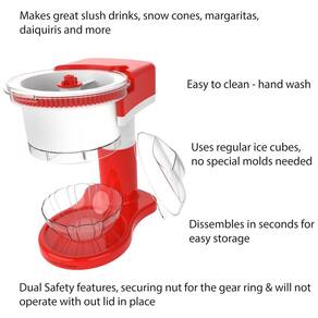 Máquina de raspadinha elétrica para uso doméstico, ideal para criar sobremesas refrescantes, cones de neve e bebidas congeladas. Utiliza cubos de gelo regulares do freezer. Possui recursos avançados de segurança dupla.Botão liga/desliga