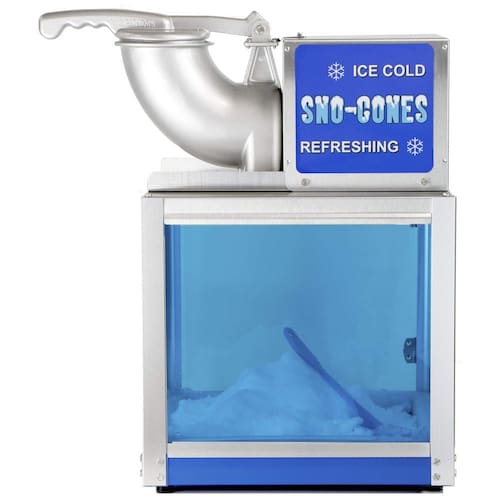 Máquina de raspadinha profissional com motor de 1,3 HP, 1725 RPM, 635 Watts. Capaz de raspar 226 kg de gelo por hora. Ideal para eventos de venda, escolas, acampamentos, parques de diversão, bares e festas.Botão liga/desliga