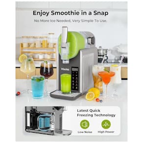 A Máquina de Frozen Vischic é fácil de usar e utiliza a mais recente tecnologia de congelamento rápido de gelo, que congela a bebida girando o hélice de forma uniforme em torno do cilindro de resfriamento. Sem necessidade de gelo. Você pode fazer frozen suaves com textura perfeita e sabor suave em apenas 15 minutos. Resultado mais rápido. Com 7 programas pré-definidos, essa máquina de frozen permite fazer margarita, milkshake, slushy, bebida congelada, frappés, coquetéis, bebidas alcoólicas e muito mais com apenas um clique. Além disso, é possível alterar a temperatura de qualquer receita conforme necessário a qualquer momento. Facilitando a limpeza, a máquina de bebidas congeladas também possui uma função de autolimpeza, basta adicionar água e pressionar LIMPAR. Para uma limpeza mais profunda, é possível colocar as outras peças, exceto a base do motor e o evaporador, na lava-louças. A melhor escolha para festas de verão, com capacidade suficiente para até 2 litros, podendo servir de 7 a 9 pessoas de uma só vez. Além disso, essa máquina de margarita mantém a bebida gelada perfeitamente por 4 horas sem diluição. Ótima para festas em casa, reuniões de verão e para quem adora bebidas congeladas! Adiciona um toque especial à cozinha, com um design elegante e moderno que se destaca em qualquer ambiente. Compacta, não ocupa muito espaço. Um sucesso absoluto na sua cozinha! Dicas úteis: Para obter melhores resultados de congelamento, certifique-se de que o teor de açúcar da bebida seja de pelo menos 6. O teor alcoólico deve estar entre 2,8 e 16. Não congele bebidas sem açúcar ou com baixo teor de açúcar na máquina, mas é possível adicionar açúcar branco, açúcar de coco, mel, etc. durante o preparo. Consulte as instruções para mais detalhes.