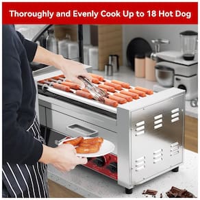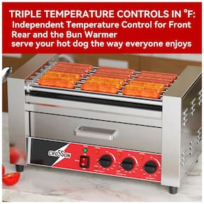 Churrasqueira de rolo para cachorro quente 2 em 1 com grelha de 7 rolos antiaderentes de aço inoxidável 304. Possui um aquecedor de pães integrado com faixa de temperatura de 0 a 85 graus, o que ajuda a manter seu cachorro quente pronto para servir. Os 7 rolos giram 360 graus para cozinhar todos os itens uniformemente, podendo suportar até 18 cachorros quentes. Conta com controles triplos de temperatura apoiados por 1350 W de potência de aquecimento, fornecendo controle independente sobre os rolos dianteiros e traseiros para que você possa preparar dois tipos diferentes de alimentos ao mesmo tempo ou usar as zonas separadas para cozinhar e armazenar simultaneamente seu produto mais popular. Além disso, possui uma bandeja coletora removível para facilitar a limpeza no final do dia. Ideal para barracas de concessão, lanchonetes e lojas de conveniência.