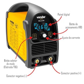 Possui prático display LED que permite regulagens mais precisas. Seu pequeno volume e baixo peso permitem ser amplamente utilizado em pequenas e médias indústrias, manutenção e trabalhos em campo. Bivolt automático, fácil manuseio e operação, possui botão para troca rápida de processos TIG/eletrodo. Conta com ajuste Arc Force, que evita que o eletrodo grude na peça durante a soldagem, e também ajuste de Hot Start, que auxilia na abertura do arco, e função Anti Sticking, que diminui a corrente caso o eletrodo fique grudado, evitando danos ao eletrodo e também ao equipamento. Além de possuir ajuste de corrente em função da bitola do eletrodo ou espessura de chapa, proporcionando a regulagem ideal para cada trabalho. Conta ainda com função VRD que reduz a tensão nos terminais de saída, que garante uma segurança maior para o operador contra choque elétrico.