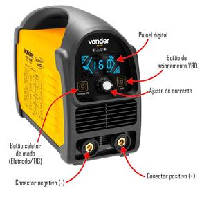 Possui prático display LED que permite regulagens mais precisas. Seu pequeno volume e baixo peso permitem ser amplamente utilizado em pequenas e médias indústrias, manutenção e trabalhos em campo. Bivolt automático, fácil manuseio e operação, possui botão para troca rápida de processos TIG/eletrodo. Conta com ajuste Arc Force, que evita que o eletrodo grude na peça durante a soldagem, e também ajuste de Hot Start, que auxilia na abertura do arco, e função Anti Sticking, que diminui a corrente caso o eletrodo fique grudado, evitando danos ao eletrodo e também ao equipamento. Além de possuir ajuste de corrente em função da bitola do eletrodo ou espessura de chapa, proporcionando a regulagem ideal para cada trabalho. Conta ainda com função VRD que reduz a tensão nos terminais de saída, que garante uma segurança maior para o operador contra choque elétrico.