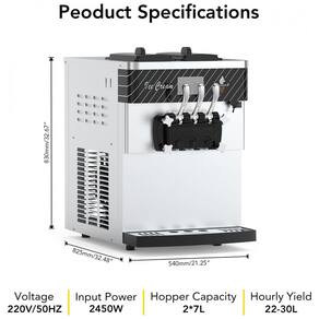 Esta máquina de sorvete soft comercial GAOMON foi desenvolvida para alta produtividade, com capacidade para produzir de 22 a 30 litros por hora. Possui dois recipientes em aço inox 304 com capacidade individual de 7 litros cada, garantindo durabilidade e resistência à corrosão. O equipamento apresenta tela sensível ao toque de 5,5 polegadas que exibe dados essenciais como dureza do sorvete, voltagem e quantidade produzida, facilitando o monitoramento e a operação.
