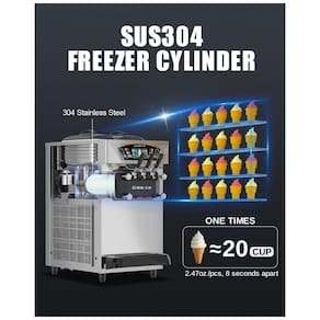 A máquina de sorvete soft comercial GSEICE é equipada com compressor EMBRACO de 2500W, que oferece alta eficiência no resfriamento, garantindo operação contínua por 6 a 8 horas. Possui dois recipientes (hoppers) de aço inox SUS304, cada um com 8 litros de capacidade, e sistema duplo de agitação magnética para evitar a formação de cristais, resultando em textura cremosa e uniforme. A produção varia de 6,8 a 8,4 galões por hora, equivalentes a 25,7 a 31,8 litros.