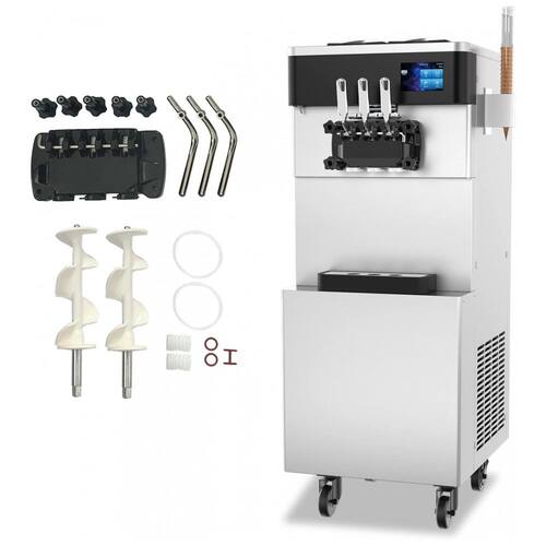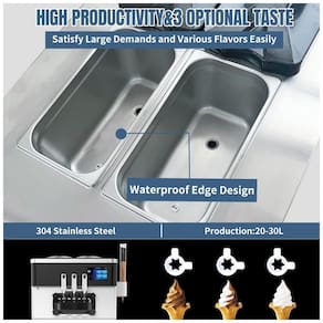 Máquina de sorvete soft comercial com 3 sabores (2 individuais e 1 mixado), painel touch LCD, função puffing, modo de frescor, alarme sonoro de mix baixo e autolimpeza.