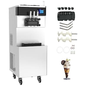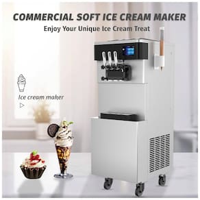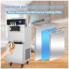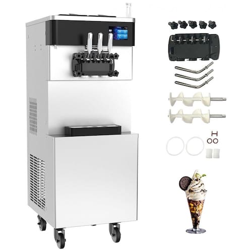 Máquina de sorvete soft comercial com compressor Embraco, painel touch LCD de 7 polegadas, função pré-resfriamento, puffing, autolimpeza e alarme de baixo nível de mix. Construída em aço inoxidável 304 grau alimentício.Bowl de congelamento