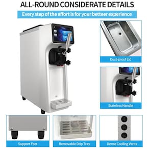 Máquina de sorvete soft comercial monosabor, alta produção, painel touch LCD 7 polegadas, funções de pré-resfriamento, puffing profundo, alarme de baixo estoque, autolimpeza, dreno para condensados, tampa protetora contra poeira, alça ergonômica, saídas de ventilação amplas, bandeja coletora removível.Bowl de congelamento