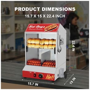 A Máquina de Vapor para Cachorro-Quente Nessxa de 40 litros possui uma grande capacidade que permite controlar facilmente festas ou clientes na loja. Perfeita para uso diário e comercial, é feita de aço inoxidável para garantir a segurança alimentar. Seu design com bandeja removível facilita a organização e limpeza. A temperatura pode ser ajustada entre 30°C a 85°C para manter os cachorros-quentes quentes e suculentos conforme necessário. Ajuste de temperatura rápido e aquecimento eficiente. Feita de aço inoxidável de alta qualidade, suporta grandes quantidades de comida sem deformar. Capacidade para 235 cachorros-quentes e 50 pães simultaneamente. Ideal para cafeterias, padarias, restaurantes, e lojas de conveniência. Display de alimentos com vidro temperado espesso, isolante e transparente. A porta deslizante facilita a visualização e manuseio dos alimentos. Uma adição necessária para qualquer estabelecimento de alimentos.