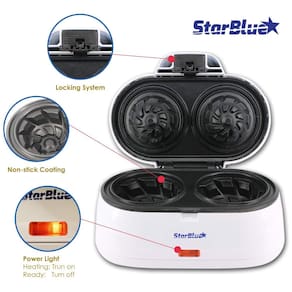 Máquina de Waffle Starblue 110v com capacidade para duas fatias, 1200W, placas antiaderentes, design de xícaras duplas para preparo simultâneo.