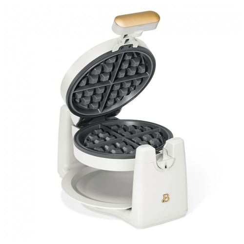 Máquina de waffle belga giratória com 1000W de potência, 7 níveis de dourado, chapas antiaderentes sem PFOA e PFOS, bandeja coletora removível e alça com toque frio. Inclui indicadores luminosos de ligado e pronto.Porta-fio