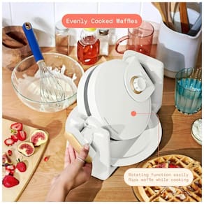 Máquina de waffle belga giratória com 1000W de potência, 7 níveis de dourado, chapas antiaderentes sem PFOA e PFOS, bandeja coletora removível e alça com toque frio. Sistema de rotação para distribuição uniforme da massa. Indicadores luminosos de ligado e pronto. Uso doméstico.Porta-fio