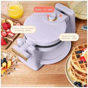 Máquina de waffle belga giratória com 1000W de potência, 7 níveis de dourado, chapas antiaderentes sem PFOA e PFOS, bandeja coletora removível e alça com toque frio. Sistema de rotação para distribuição uniforme da massa. Indicadores luminosos de ligado e pronto. Uso doméstico.Porta-fio