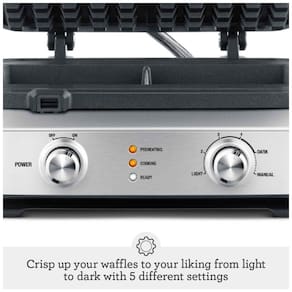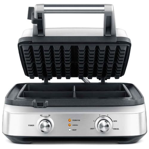Máquina de Waffle Breville BWM604BSS com capacidade para 4 fatias, ajuste de temperatura para diferentes estilos de waffle e sistema anti-bagunça.Porta-fio